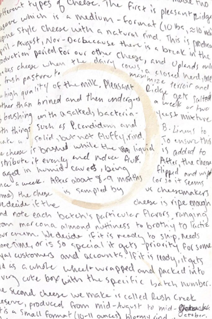 For those of us who embrace the complexity of working within a complex relation of plants, fungi, animals, and soil, the work of an artisanal cheesemaker is to allow the cheese to express the individuality of the landscape, animals, and people who brought it into the world.  If the cheesemaker is aware of the landscape, they can work with the milk to coax out these features through choices in time, temperature, and form. This manifests as nuances in the flavor and texture. A stream that runs through pasture might leave a soft minerality. An abundance of clover often leaves sweet, custardy notes in the curd. Beautiful cheeses, in this way, are manifestations of acquaintance.