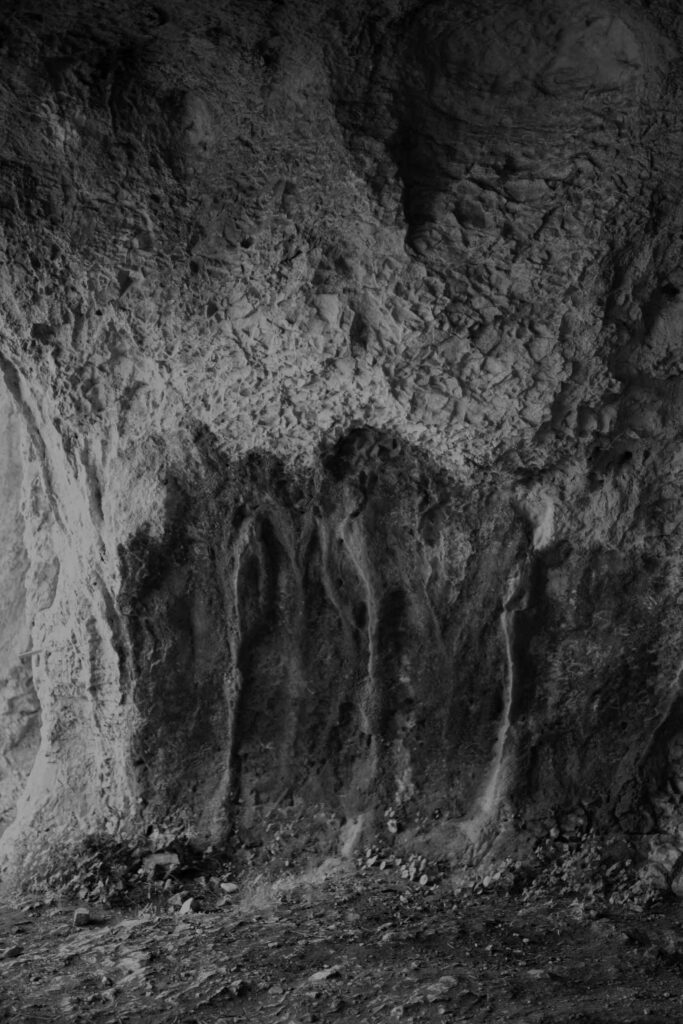 A feeling of fascination and fear runs through my body as I explore these sacred spaces—a primitive urge for mystical participation. Geological formations appear not only as tombs, shelters or natural treasures but also as metaphors for the configuration of the unconscious. In these depths, I seek the traces of my past lives and the psychic landscapes they inhabit.